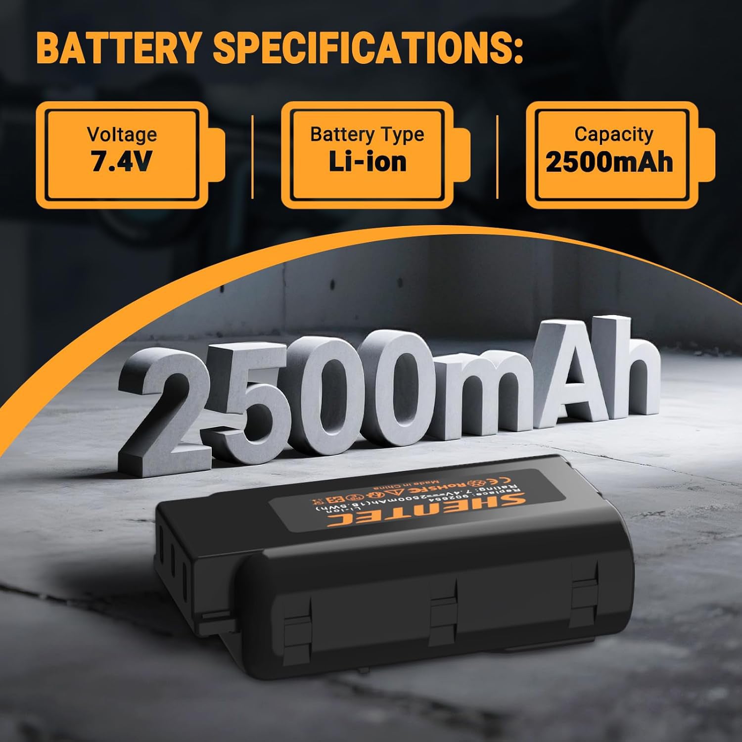 • Battery Type: Li-ion; Voltage: 7.4V; Capacity: 2500mAh; 2-Pack.